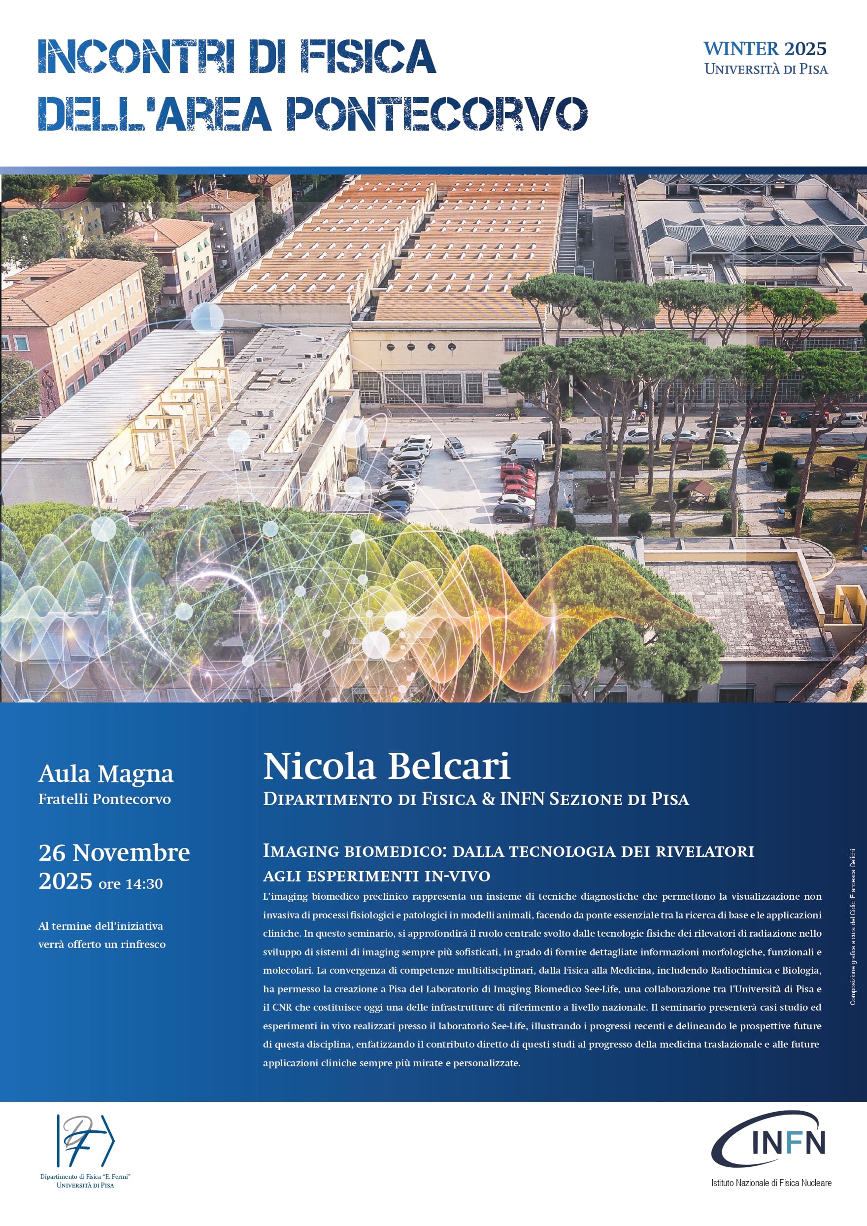 In this seminar we will explore the central role played by physical technologies of radiation detectors in the development of increasingly sophisticated imaging systems capable of providing detailed morphological, functional and molecular information.The convergence of multidisciplinary expertise — from Physics to Medicine, including Radiochemistry and Biology — has enabled the creation in Pisa of the See‑Life Biomedical Imaging Laboratory, a collaboration between the University of Pisa and the Consiglio Nazionale delle Ricerche (CNR), which today constitutes one of the national reference infrastructures.